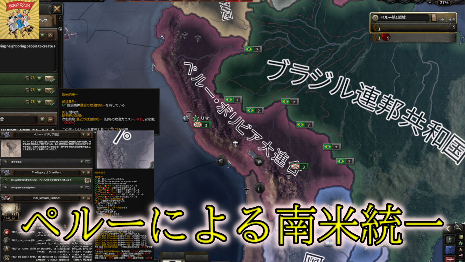 サボり復帰のまともな記事第一弾はペループレイ。目標は南米統一。ちなみに今回は「ROAD TO 56」っていうNF拡張MODを入れたプレイしていく。