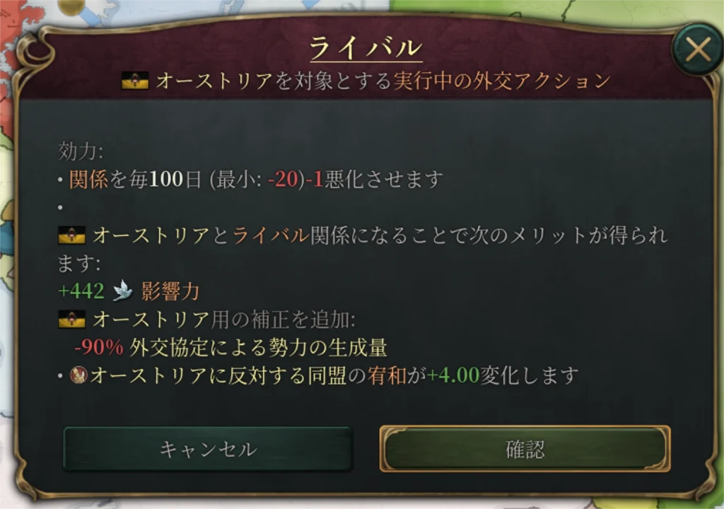 まずプレイを始めてすぐオーストリアにライバル宣言をしとく。近々普墺戦争を起こすつもりだから関係は悪化させるに越したことはない。