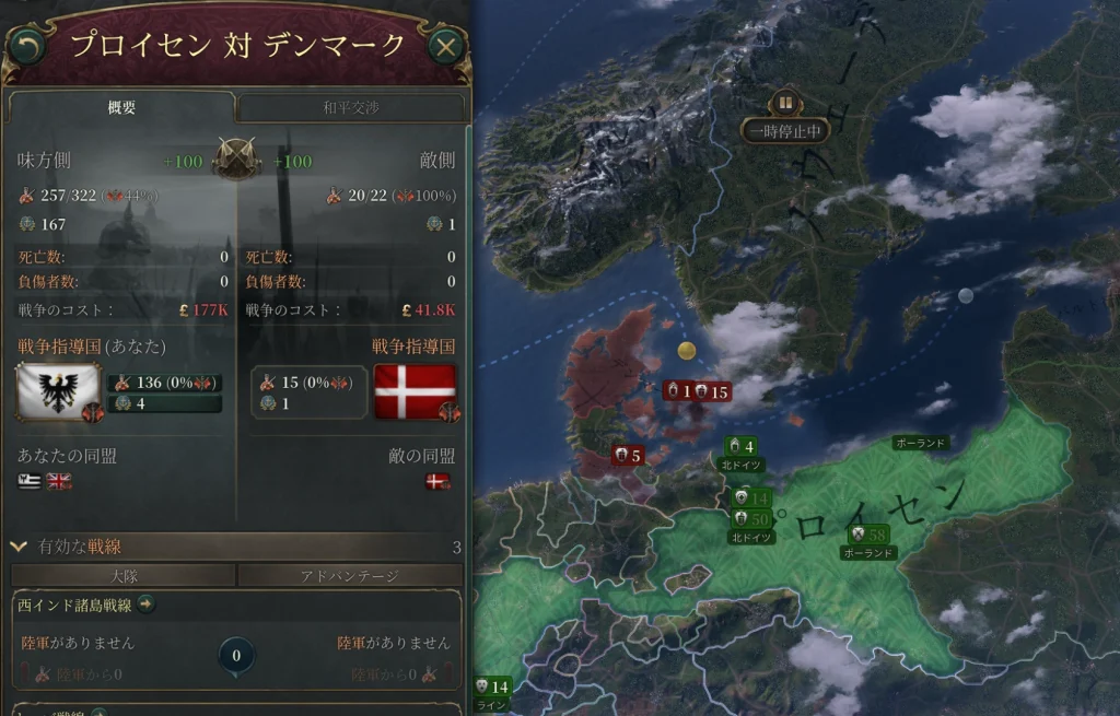 そんなこんなしてるときにどさくさに紛れて戦争を始めた。シュレースヴィヒ=ホルシュタイン戦争ってやつやな。一応同盟国にイギリスが召喚されてるけど別に必要はないよな。ヨユーすぎる。
