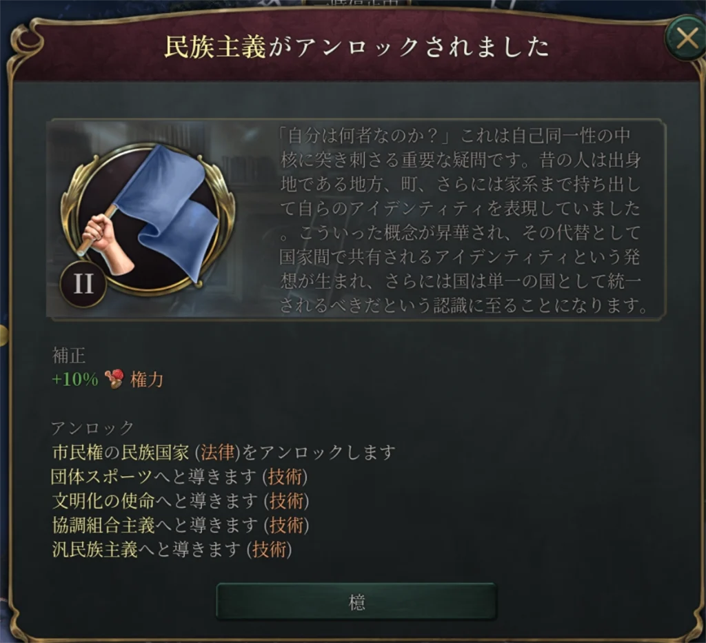 その前に民族主義をアンロックしておく。これがないと統一出来ないらしい。