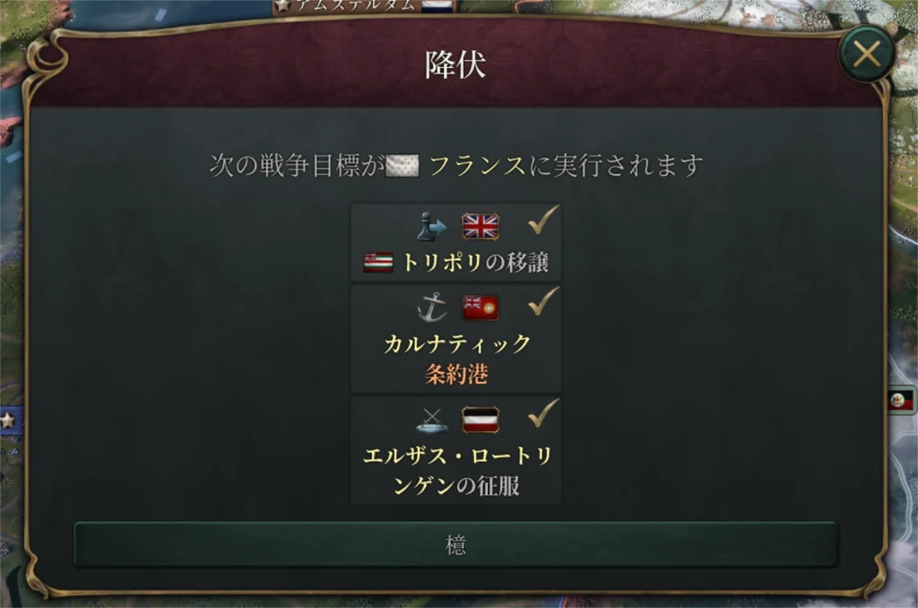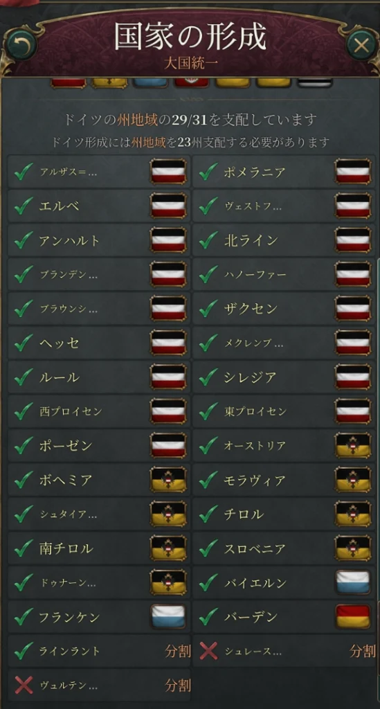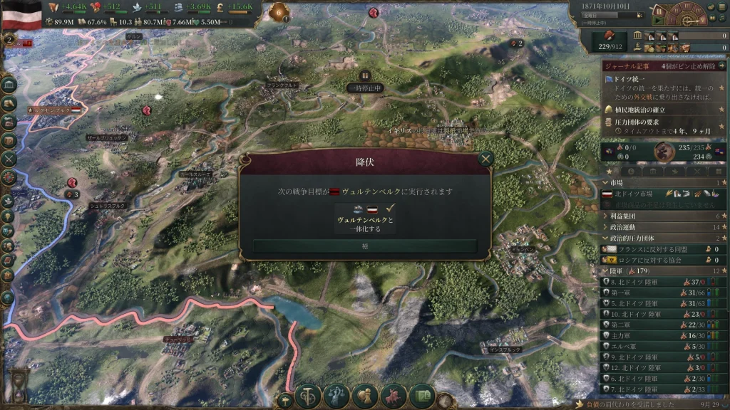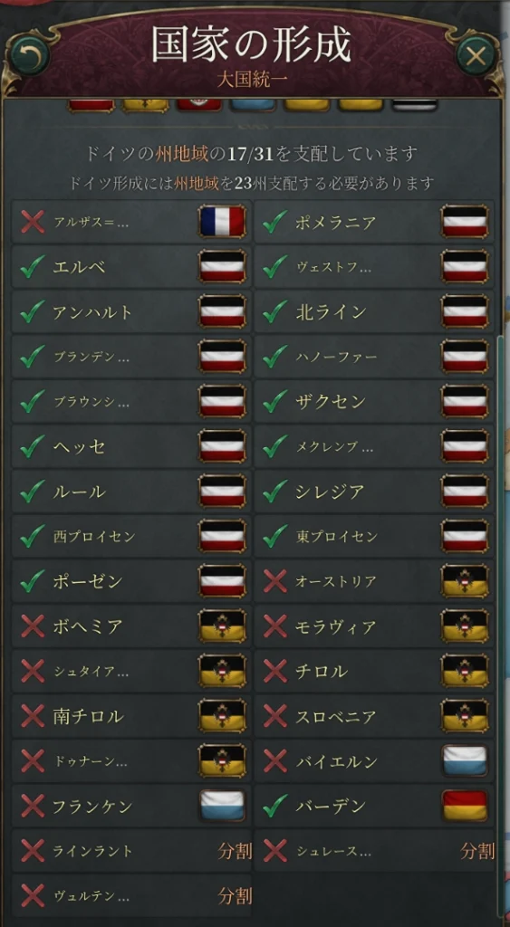 エルザス・ロートリンゲンを獲得したし、あとはオーストリアとか謎の小国を懐柔すればいいだけ。と言ってもまた戦争するのはあまり現実的じゃないってことで平和的に進めていく。