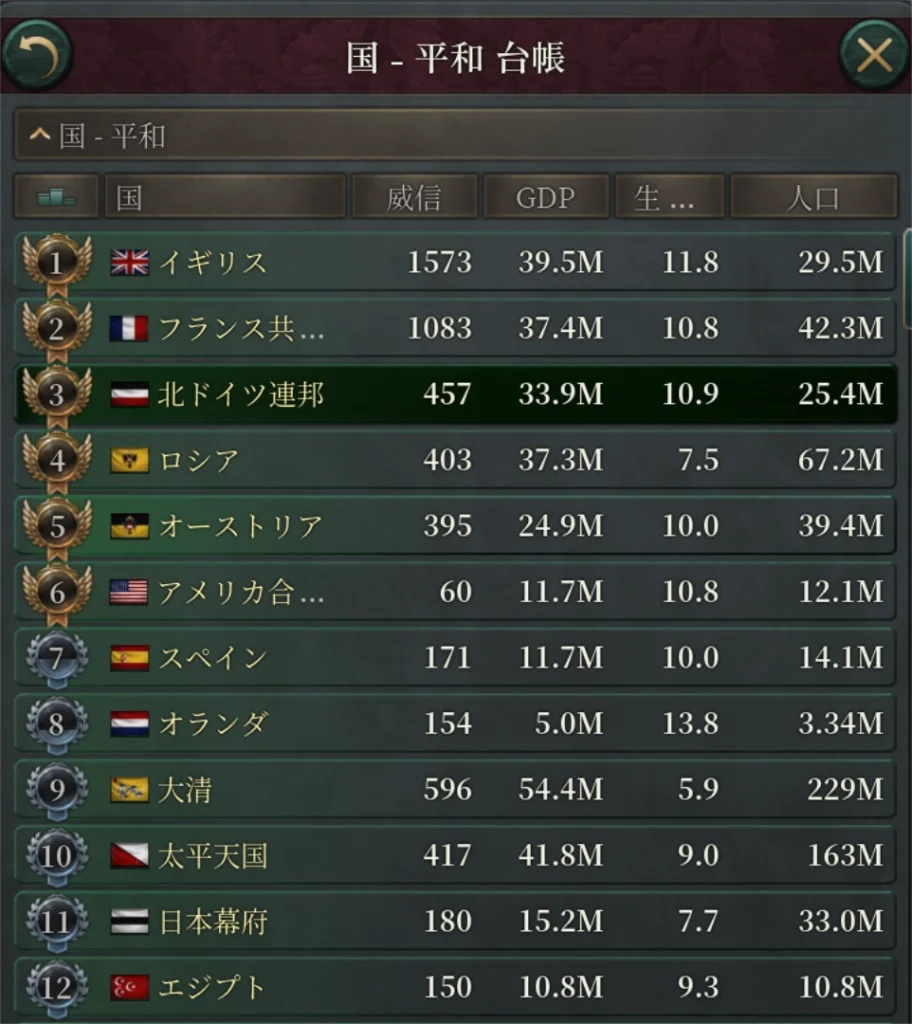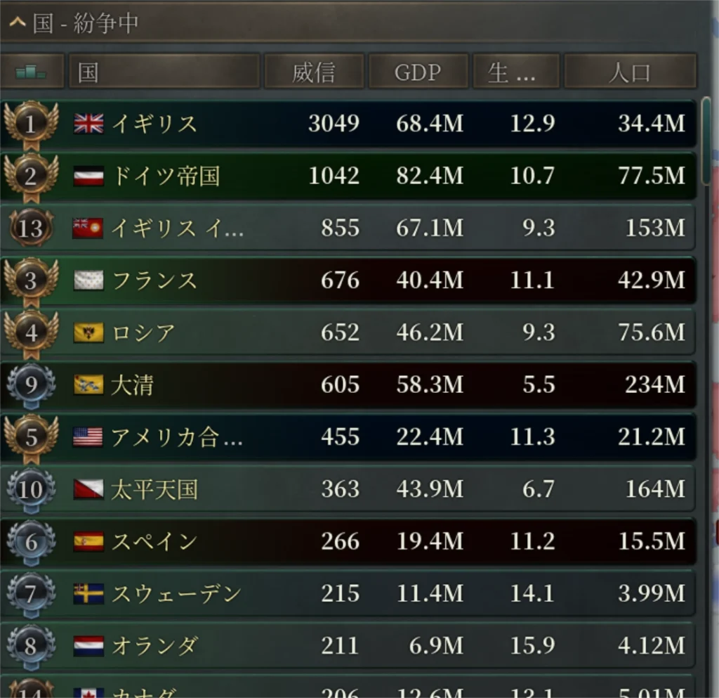 さて、これだけ巨大な国になったしさぞ強い国になったんでしょう、列強ランクも1位かなって思って見てみると…