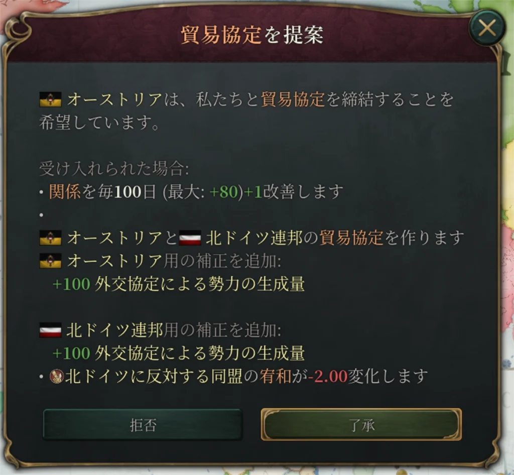 オーストリアと関係改善したり、お金あげたりしてたら、貿易協定が飛んできた。もちろん結びますとも。仲良くしましょうや。