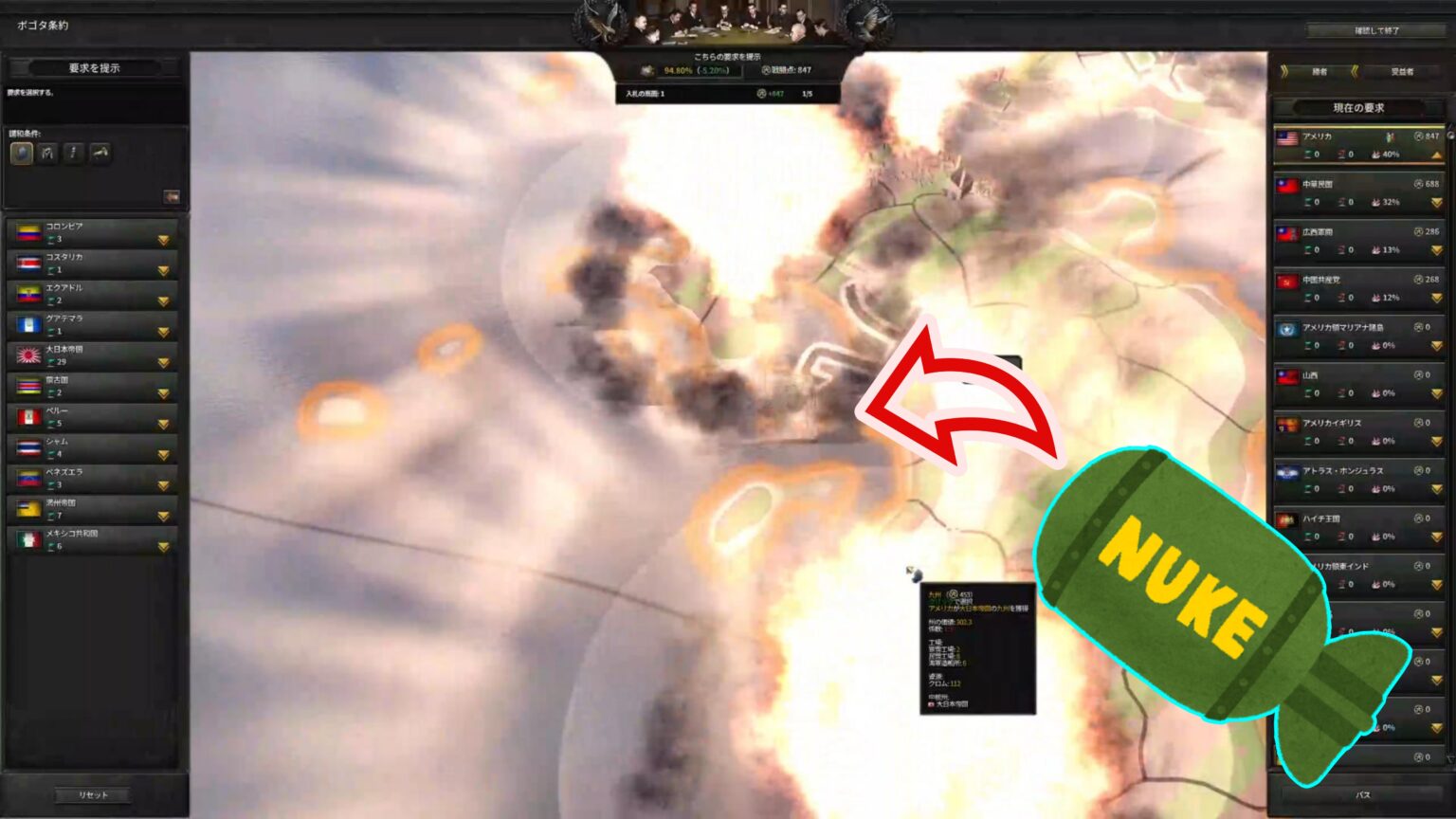 ちなみに、日本戦をやってる間に南米の従属しなかった国に宣戦布告したから、大東亜共栄圏に入られたりもした。特に見どころもないからカット。コロンビア、ペルー、ベネズエラに宣戦布告してた。