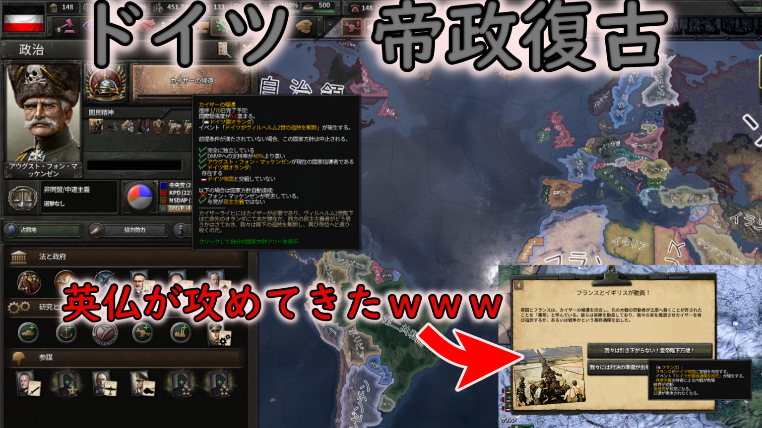 今回はドイツ帝国を再建していく。ww1でドイツ皇帝はオランダに亡命したわけだけど、ww2らへんのころも生きている。戦後どうなったのかは知らんけど。ということでその皇帝を呼び出して帝政復古していくって感じだね。